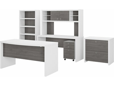 Bush Business Furniture Echo 60"W Bow Front Desk, Credenza w/ Hutch, Bookcase and File Cab, Pure White/Modern Gray (ECH029WHMG)