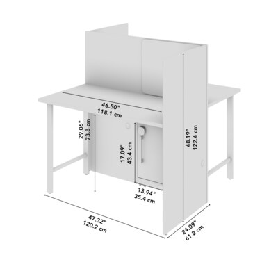 The Bush Business Furniture Hustle 48-inch 2 Person Office Cubicles with Locking Storage Cabinet instantly turn any space into a private and productive work area. Dual workstations with 1-inch-thick desktops hold multiple monitors and equipment with 200-pound weight capacities. The surfaces feature a melamine finish that protects against scratches, stains, and other cosmetic damage. Under desk storage cabinets with customizable keypad locks securely store valuables. Desktop power grommets with AC outlets and USB-A/USB-C ports make charging devices easy while wire management pass throughs keep cords and cables in order. Set up the tackboard on either panel to hang reminders or give each workstation a personal touch with office decor. This two person cubicle desk set has been designed and tested to meet ANSI/BIFMA standards for safety and performance and is backed by a 10 Year Warranty.
