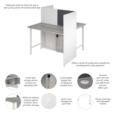 The Bush Business Furniture Hustle 48-inch 2 Person Office Cubicles with Locking Storage Cabinet instantly turn any space into a private and productive work area. Dual workstations with 1-inch-thick desktops hold multiple monitors and equipment with 200-pound weight capacities. The surfaces feature a melamine finish that protects against scratches, stains, and other cosmetic damage. Under desk storage cabinets with customizable keypad locks securely store valuables. Desktop power grommets with AC outlets and USB-A/USB-C ports make charging devices easy while wire management pass throughs keep cords and cables in order. Set up the tackboard on either panel to hang reminders or give each workstation a personal touch with office decor. This two person cubicle desk set has been designed and tested to meet ANSI/BIFMA standards for safety and performance and is backed by a 10 Year Warranty.