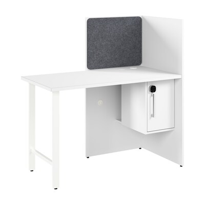 The Bush Business Furniture Hustle 48-inch Cubicle Desk for Office instantly turns any space into a private and productive work area. Spread out on a robust 1-inch-thick desktop that holds multiple monitors and other equipment with a 200-pound weight capacity. The work surface features a durable melamine finish that protects against scratches, stains, and other cosmetic damage to preserve the computer desk's appearance. Take advantage of the under desk storage cabinet with keypad lock to secure valuables. A desktop power grommet with AC outlet and USB-A/USB-C ports makes charging devices easy while wire management pass throughs keep cords and cables in order. Set up the tackboard on either panel to display reminders or office decor. This modern cubicle desk has been designed and tested to meet or exceed ANSI/BIFMA standards for safety and performance and is backed by a 10 Year Warranty.