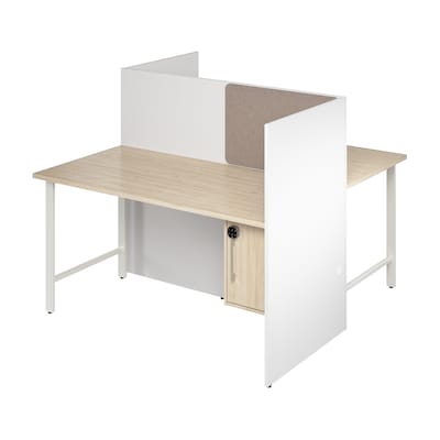 The Bush Business Furniture Hustle 60-inch 2 Person Office Cubicles with Locking Storage Cabinet instantly turn any space into a private and productive work area. Dual workstations with 1-inch-thick desktops hold multiple monitors and equipment with 200-pound weight capacities. The surfaces feature a melamine finish that protects against scratches, stains, and other cosmetic damage. Under desk storage cabinets with customizable keypad locks securely store valuables. Desktop power grommets with AC outlets and USB-A/USB-C ports make charging devices easy while wire management pass throughs keep cords and cables in order. Set up the tackboard on either panel to hang reminders or give each workstation a personal touch with office decor. This two person cubicle desk set has been designed and tested to meet ANSI/BIFMA standards for safety and performance and is backed by a 10 Year Warranty.