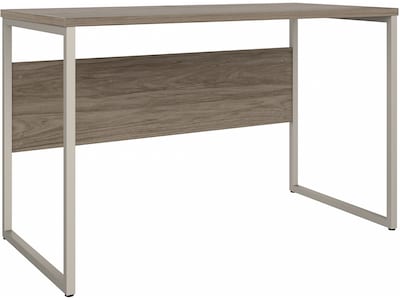 The Bush Business Furniture Hybrid 48"W x 24"D computer table desk blends a durable work surface with sturdy metal legs to offer a stylish, long-lasting solution for the modern professional. Tackle your next project or assignment with a computer, books, paperwork, and more on a desktop that supports up to 200 lbs. A built-in wire management grommet keeps cords and cables in order, so your work area remains free from unnecessary clutter. The computer desk's open leg design and finished privacy panel allow it to look great facing any direction in a home or professional office environment. Find the perfect look for your space with five contemporary finish options: black walnut, modern hickory, platinum gray, storm gray, and white. This modern desk has been meticulously tested to meet or exceed ANSI/BIFMA quality standards for safety, durability, and performance and is backed by the Bush Business Furniture 10-year manufacturer warranty. See the full Hybrid collection for coordinating items to enhance your workspace as needed, including file cabinets, bookcases, and storage cabinets (coordinating items sold separately). American-made with US and imported parts.
