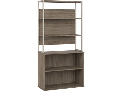 The Bush Business Furniture Hybrid tall etagere bookcase offers a stylish, long-lasting storage and display solution for the modern professional. Organize books and other reference materials, or decorate your workspace to give it a personal touch on shelves that support up to 50 lbs. each. The lower section contains one fixed shelf for stability and another that can be raised or lowered to accommodate items of various sizes. The open shelves are perfect for storing a small library or showcasing your favorite plants, pictures, and knickknacks. The tall bookcase's stable design and included wall attachment hardware make it a safe choice for use in virtually any home or professional office environment. Find the perfect look for your space with five contemporary finish options: black walnut, modern hickory, platinum gray, storm gray, and white. This five-shelf bookcase has been meticulously tested to meet or exceed ANSI/BIFMA quality standards for safety, durability, and performance and is backed by the Bush Business Furniture 10-year manufacturer warranty. See the full Bush Business Furniture Hybrid collection for coordinating items to enhance your workspace as needed, including computer desks, file cabinets, and storage cabinets (coordinating items sold separately). American-made with US and imported parts.