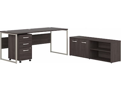 The Bush Business Furniture Hybrid computer table desk with storage and a mobile file cabinet blends a durable work surface with sturdy metal legs to offer a stylish, long-lasting solution for the modern professional. Tackle your next project or assignment with a computer, books, and more on a desktop that supports up to 200 pounds. Three built-in wire management grommets keep cords and cables in order, so your work area remains free from unnecessary clutter. The computer desk's open leg design and finished privacy panel allow it to look great facing any direction in a home or professional office. The filing cabinet's bottom drawer accepts letter-, legal- and A4-size paperwork, while a pair of box drawers organize supplies. The two bottom drawers can be locked to protect sensitive files and personal items. The storage credenza's open and closed compartments each include one fixed and one adjustable shelf to accommodate everything from reference materials to plants, pictures, and decorations. Each shelf supports up to 50 pounds, so storing larger items is no problem. Find the perfect look for your space with five finish options: black walnut, modern hickory, platinum gray, storm gray and white. This modern desk with drawers and shelves has been meticulously tested to meet or exceed ANSI/BIFMA quality standards for safety, durability and performance and is backed by the Bush Business Furniture 10-year manufacturer's warranty.