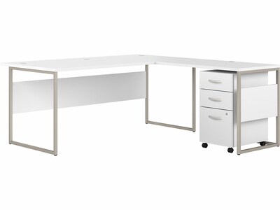 The Bush Business Furniture Hybrid 72"W x 36"D L-shaped table desk with three-drawer mobile file cabinet blends a durable work surface with sturdy metal legs to offer a stylish, long-lasting solution for the modern professional. Tackle your next project or assignment with a computer, books, and more on a desktop that supports up to 200 lbs. Four built-in wire management grommets keep cords and cables in order, so your work area remains free from unnecessary clutter. The corner computer desk's open leg design and finished privacy panel allow it to look great facing any direction in a home or professional office. The file cabinet's bottom drawer accepts letter-, legal-, and A4-size paperwork, while a pair of box drawers organize supplies. The two bottom drawers can be locked to protect sensitive files and personal items. Find the perfect look for your space with five finish options: black walnut, modern hickory, platinum gray, storm gray, and white. This L-shaped desk with drawers has been meticulously tested to meet or exceed ANSI/BIFMA quality standards for safety, durability, and performance and is backed by the Bush Business Furniture 10-year manufacturer warranty. See the full Hybrid collection for coordinating items to enhance your workspace as needed, including bookcases, lateral file cabinets, and storage cabinets (coordinating items sold separately). American-made with US and imported parts.