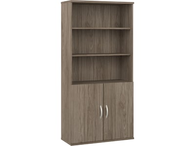 The Bush Business Furniture Hybrid tall five-shelf bookcase with doors offers a stylish, long-lasting storage and display solution for the modern professional. Organize books and other reference materials, or give your workspace a personal touch with pictures and decorations on shelves that support up to 50 lbs. each. Two shelves are fixed for stability, while three can be raised or lowered to accommodate items of various sizes. Cabinet doors conceal the two lower shelves for the materials you want to be kept in order but out of sight. The tall bookshelf's stable design and included wall attachment hardware make it a safe choice for use in virtually any home or professional office environment. Find the perfect look for your space with five contemporary finish options: black walnut, modern hickory, platinum gray, storm gray, and white. This tall bookcase cabinet has been meticulously tested to meet or exceed ANSI/BIFMA quality standards for safety, durability, and performance and is backed by the Bush Business Furniture 10-year manufacturer warranty. See the full Bush Business Furniture Hybrid collection for coordinating items to enhance your workspace as needed, including computer desks, file cabinets, and storage cabinets (coordinating items sold separately). American-made with US and imported parts.