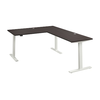 Treat yourself to a healthier, more productive workspace with Bush Business Furniture's Move 60 Series L Shaped Standing Desk. The height adjustable desk quickly and easily lifts from a low of 27 inches to a high of 46.7 inches; just lift up or press down on the control panel to raise or lower the surface. Set a custom alert to remind you when to change positions and use the electric desk's preset feature to save two preferred heights. The thermally fused laminate surface is resistant to scratches and stains while 16-gauge steel legs support the corner standing desk for a weight capacity of 200 pounds. The 10-foot power cord plugs into a standard outlet so the sit-stand desk can be used in virtually any setting. This ergonomic office desk has been rigorously tested to meet or exceed ANSI/BIFMA quality standards for safety, durability and performance and is backed by a 5 Year Warranty.