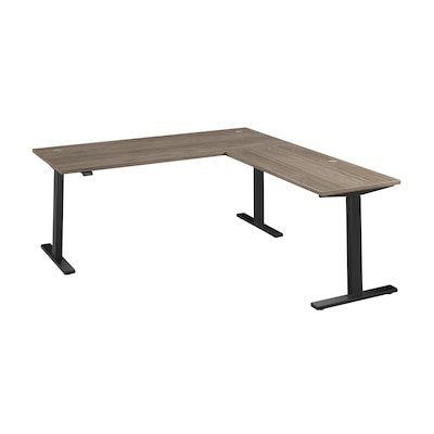Treat yourself to a healthier, more productive workspace with Bush Business Furniture's Move 60 Series L Shaped Standing Desk. The height adjustable desk quickly and easily lifts from a low of 27 inches to a high of 46.7 inches; just lift up or press down on the control panel to raise or lower the surface. Set a custom alert to remind you when to change positions and use the electric desk's preset feature to save two preferred heights. The thermally fused laminate surface is resistant to scratches and stains while 16-gauge steel legs support the corner standing desk for a weight capacity of 200 pounds. The 10-foot power cord plugs into a standard outlet so the sit-stand desk can be used in virtually any setting. This ergonomic office desk has been rigorously tested to meet or exceed ANSI/BIFMA quality standards for safety, durability and performance and is backed by a 5 Year Warranty.