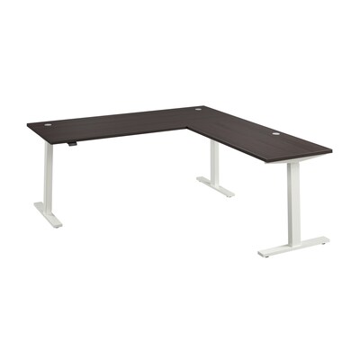 Treat yourself to a healthier, more productive workspace with Bush Business Furniture's Move 60 Series L Shaped Standing Desk. The height adjustable desk quickly and easily lifts from a low of 27 inches to a high of 46.7 inches; just lift up or press down on the control panel to raise or lower the surface. Set a custom alert to remind you when to change positions and use the electric desk's preset feature to save two preferred heights. The thermally fused laminate surface is resistant to scratches and stains while 16-gauge steel legs support the corner standing desk for a weight capacity of 200 pounds. The 10-foot power cord plugs into a standard outlet so the sit-stand desk can be used in virtually any setting. This ergonomic office desk has been rigorously tested to meet or exceed ANSI/BIFMA quality standards for safety, durability and performance and is backed by a 5 Year Warranty.