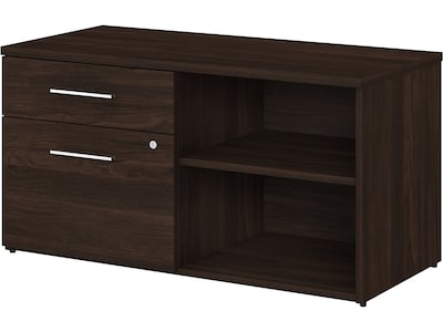 The Bush Business Furniture Office 500 low storage cabinet with drawers and shelves features a practical design that's perfect for the modern workplace. The Bush Business Furniture Office 500 low storage cabinet with drawers and shelves presents a practical solution for keeping work materials organized in any professional space. On the left side of the cabinet a file drawer with smooth full-extension ball bearing slides holds legal-, letter-, and A4-size paperwork, while a box drawer stores miscellaneous office supplies. A single lock secures both drawers to protect sensitive documents and personal items. The right side features one fixed shelf and one adjustable shelf to accommodate books, binders, and reference materials of various sizes. The surface of the low storage credenza makes a great printer stand or laptop charging station and can also be used to display decorations. This office cabinet is tested to meet ANSI/BIFMA standards for safety and performance and is backed by a 10-year warranty. American-made with US and imported parts.