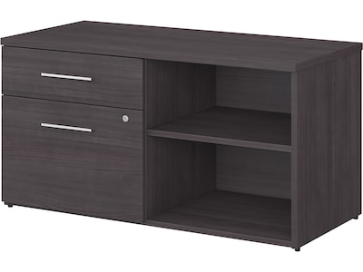 The Bush Business Furniture Office 500 low storage cabinet with drawers and shelves features a practical design that's perfect for the modern workplace. This storage cabinet presents a practical solution for keeping work materials organized in any professional space. On the left side of the cabinet, a file drawer with smooth full-extension ball bearing slides holds legal-, letter-, and A4-size paperwork while a box drawer stores miscellaneous office supplies. A single lock secures both drawers to protect sensitive documents and personal items. The right side features one fixed shelf and one adjustable shelf to accommodate books, binders, and reference materials of various sizes. The surface of the low storage cabinet makes a great printer stand or laptop charging station and can also be used to display decorations. This office cabinet is tested to meet ANSI/BIFMA standards for safety and performance and is backed by a 10-year warranty. American-made with US and imported parts.