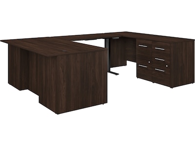 The Bush Business Furniture Office 500 71"W height-adjustable U-shaped executive desk with drawers offers an ergonomic workspace with professional style. With its impressive breakfront design and the flexibility to sit or stand at the push of a button, this executive desk presents a perfect workspace for the modern professional. Take a prominent position in your private office as you spread out on a spacious wraparound desk with built-in wire management. The 48"W x 23"D height-adjustable standing desk lifts anywhere from 27" to 47" and includes four presets that allow you to change positions quickly and easily throughout the day. Two lockable file cabinets fit under the fixed desktop for easy access to legal-, letter-, and A4-size paperwork and supplies. This adjustable desk with storage is tested to meet ANSI/BIFMA standards for safety and performance.