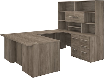 The Bush Business Furniture Office 500 71"W U-shaped executive desk with drawers and hutch offer a modern workspace with professional style and quality. Highlighted by its distinctive breakfront design, this executive desk with drawers and hutch present a workspace that showcases the style and personality of today's professional. Spread out on a spacious wraparound desktop that has built-in wire management and supports up to 200 lbs. Two file cabinets fit under the desktop for easy access to legal-, letter-, and A4-size paperwork and supplies. All three file drawers and one of two box drawers can be locked to secure sensitive documents and personal items. The 71"W hutch adds plenty of open space for books, pictures, awards, and decorations while a small storage cabinet conceals reference materials and accessories. This U-shaped desk with storage is tested to meet ANSI/BIFMA standards for safety and performance and is backed by a 10-year manufacturer limited warranty. American-made with US and imported parts.