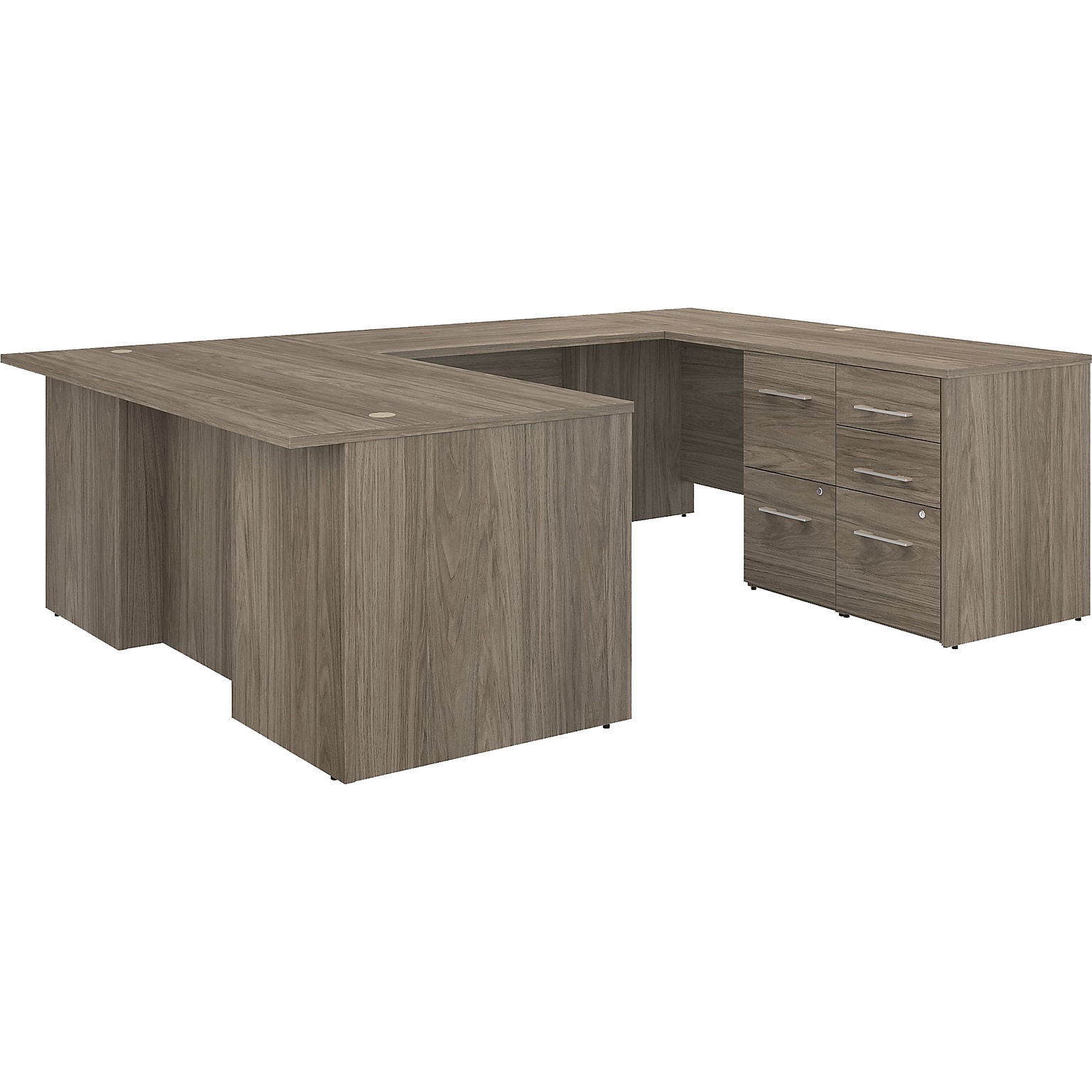 The Bush Business Furniture Office 500 71"W U-shaped executive desk with drawers provides a modern workspace with professional style and quality. Highlighted by its distinctive breakfront design, this desk presents a workspace that showcases the style and personality of today's professional. Take a prominent position in your private office as you spread out on a spacious wraparound desktop with built-in wire management. A three-drawer and two-drawer file cabinets fit underneath the U-shaped desk for easy access to materials. File drawers accept legal-, letter-, and A4-size paperwork while two box drawers organize writing utensils, notepads, and other supplies. All three file drawers and one box drawer can be locked to secure sensitive documents and personal items. This U-shaped desk with storage is tested to meet ANSI/BIFMA quality standards for safety and performance and is backed by a 10-year manufacturer's warranty. American-made with US and imported parts.