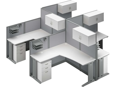 The Bush Business Furniture Office in an Hour collection is a great solution for converting empty space into a practical and productive work environment. Designed with convenience in mind, this four-person L-shaped cubicle desk and storage set is simple to order and install so you can get your workplace up and running instantly. The commercial office desks support up to 200 lbs., while a thermally fused laminate finish protects against scratches, stains, and other cosmetic damage. Desktop grommets and removable leg panels keep cords and cables in order to maintain a neat work space. Each L-shaped computer desk has a 63"H panel for privacy and a 48"H panel for communication; the panels can be installed on either side for a custom layout. The mobile file cabinets' locking drawers hold letter-, legal-, and A4-size files along with supplies and personal items. Dual-wheel casters move the rolling file cabinets wherever the organization is needed, including beneath the work surfaces for under-desk storage. Storage cabinets mount to either side of the tall cubicle panels for easy access to books, manuals, and other materials. Paper trays and pencil holders organize work in progress and writing utensils, so you can access supplies without breaking focus. This four-person L-shaped desk with drawers and storage set has been meticulously tested to meet or exceed the ANSI/BIFMA quality standards for safety and performance and is backed by the Bush Business Furniture 10-year manufacturer warranty.