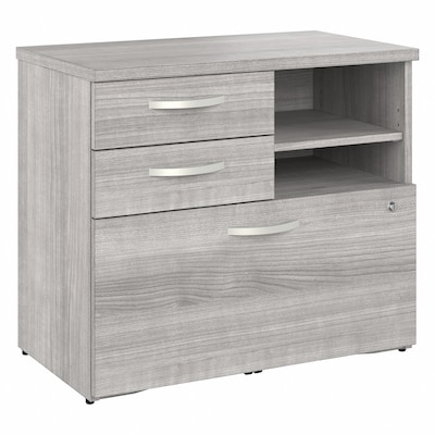 The Bush Business Furniture Studio A office storage cabinet with drawers and shelves combines a fresh contemporary appearance with the commercial-quality construction needed to withstand years of everyday use. Keep important documents, office supplies, work in progress, and equipment in order, so you can access the materials you need quickly and easily. A file drawer opens on smooth full-extension ball bearing slides for an effortless reach to letter-, legal-, and A4-size paperwork and can be locked to protect sensitive information. Two box drawers organize writing utensils, notepads, and other supplies, while the open shelves are great for frequently used items. The cabinet with shelves has been meticulously tested to meet or exceed the ANSI/BIFMA quality standards for safety, durability, and performance and is backed by a 10-year manufacturer limited warranty. American-made with US and imported parts.