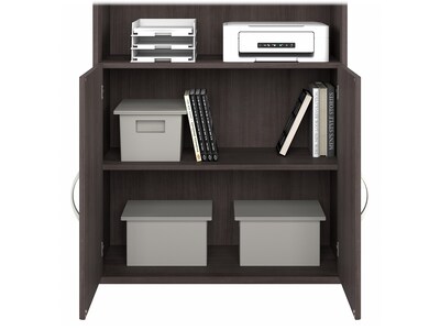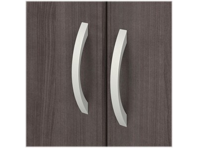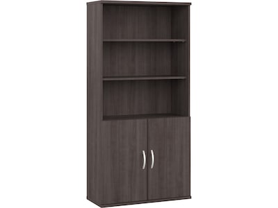 The Bush Business Furniture Studio A tall five-shelf bookcase with doors combines a fresh contemporary appearance with the commercial-quality construction needed to withstand years of everyday use. Organize books and reference materials, or display pictures and decorations on the shelves that support up to 50 lbs. each. Two shelves are fixed for stability, while three can be raised or lowered to accommodate items of various sizes. The cabinet doors conceal the two lower shelves for the materials you want kept in order but out of sight. The tall bookcase's stable design and wall attachment hardware make it a safe choice for use in virtually any home or professional office environment. This tall bookcase has been meticulously tested to meet or exceed the ANSI/BIFMA standards for safety, durability, and performance and is backed by a 10-year warranty. American-made with US and imported parts.