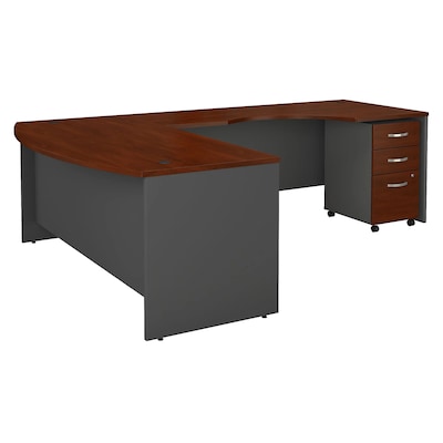 Give your office the workspace you need and the style you deserve with this Bush Business Furniture Studio C U-shaped desk with mobile file cabinet. The extended surface of the bow front desk offers guests a rounded front to pull up a chair and collaborate, while the expansive U-shaped configuration has all the room you could ever want to spread out and multitask. With a thermally fused laminate finish, this office set stands up to years of everyday use. Keep pesky computer cords out of your way with a cable management system for a neat work surface. The three-drawer file cabinet rolls throughout your office or remains in place as needed. One file drawer accepts legal-, letter-, and A4-size paperwork while two box drawers organize supplies. This desk with storage set comes with a 10-year warranty and meets ANSI/BIFMA quality test standards. American-made with US and imported parts.