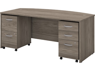 Give your office the workspace you need and the style you deserve with the Bush Business Furniture Studio C 72"W bow front desk and mobile file cabinets. The extended bow front desk surface offers extra space to spread out with a computer, materials and more while giving guests a rounded front to pull up a chair and collaborate. With a durable thermally fused laminate finish, this office furniture set stands up to years of everyday use. Keep pesky computer cords out of your way with the cable management system for an organized work surface while storing your paperwork in the lockable mobile file cabinets. Full-extension file drawers with smooth ball-bearing slides accept letter-, legal- and A4-size documents. This desk with a storage set comes with a 10-year manufacturer's warranty and meets ANSI/BIFMA test standards for performance and safety. American made with U.S. and imported parts.