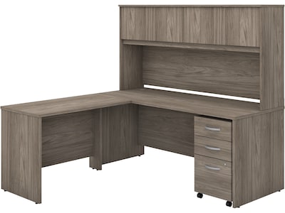Choose this Bush Business Furniture Studio C L-shaped desk with hutch and mobile file cabinet for a comfortable design that works with you for years. The thermally fused laminate finish, durable edge banding, and sturdy end panels resist scratches, stains, and dents while standing up to the rigors of a 40-plus hour work week. The 42"W return attaches to either side of the 72"W desk to form a left- or right-handed L-shaped layout. With four doors featuring self-closing Euro-style hinges, the hutch conveniently stores office supplies, books, and more. The three-drawer file cabinet rolls throughout your office or remains in place as needed on any surface. One file drawer accepts legal-, letter-, and A4-size paperwork while two box drawers organize supplies. This desk with storage set comes with a 10-year manufacturer limited warranty and meets ANSI/BIFMA quality test standards. American-made with US and imported parts.