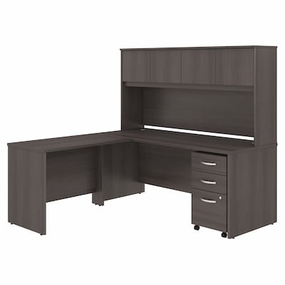 Choose this Bush Business Furniture Studio C L Shaped Desk with Hutch for a comfortable design that works with you for years and a fresh finish that looks great anywhere. With a thick surface, an extended modesty panel and clean lines, the L Shaped Desk conveys a classic look but adds a contemporary White or Storm Gray finish to meet the style needs of the modern workspace. The thermally fused laminate finish, durable edge banding and sturdy end panels resist scratches, stains or dents while standing up to the rigors of a 40-plus hour work week. Keep pesky computer cords out of your way with the cable management system for an organized work surface. The 42W Return attaches to either side of the Desk to form a left or right handed L Shaped layout. With 4 doors featuring self-closing Euro-style hinges, the Hutch conveniently stores office supplies, books and more. The 3 Drawer Mobile File Cabinet rolls with you throughout your office or remains in place as needed on any surface. This contemporary office furniture comes with a 10 Year Warranty and meets ANSI/BIFMA quality test standards. American made with U.S. and imported parts.
