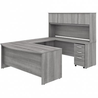Choose the Bush Business Furniture Studio C 71"W U-shaped desk with hutch and mobile file cabinet for a classic office set with contemporary style. Give your office the workspace you need and the style you deserve with this Bush Business Furniture Studio C U-shaped desk with hutch and mobile file cabinet. The extended 71"W x 35.41"D bow front desk surface offers guests a rounded front to pull up a chair, while the expansive U-shaped layout has all the room you could ever want to spread out. Featuring a thermally fused laminate finish, this office set stands up to years of everyday use. With four doors, the hutch stores office supplies, books and more. The three-drawer mobile file cabinet rolls with you throughout your office or remains in place, as needed. One file drawer accepts legal-, letter- and A4-size paperwork while two box drawers organize small office supplies. The Studio C office set comes with a 10-year manufacturer limited warranty and meets ANSI/BIFMA standards. American-made with US and imported parts.