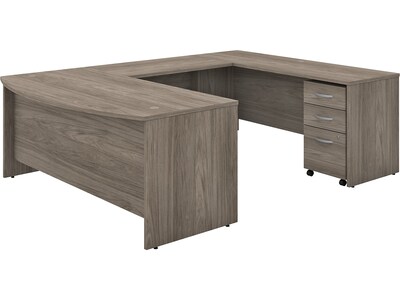 Give your office the workspace you need and the style you deserve with this Bush Business Furniture Studio C U-shaped desk with mobile file cabinet. The extended surface of the bow front desk offers guests a rounded front to pull up a chair and collaborate, while the expansive U-shaped configuration has all the room you could ever want to spread out and multitask. With a thermally fused laminate finish, this office set stands up to years of everyday use. Keep pesky computer cords out of your way with a cable management system for a neat work surface. The three-drawer file cabinet rolls throughout your office or remains in place as needed. One file drawer accepts legal-, letter-, and A4-size paperwork while two box drawers organize supplies. This desk with storage set comes with a 10-year warranty and meets ANSI/BIFMA quality test standards. American-made with US and imported parts.