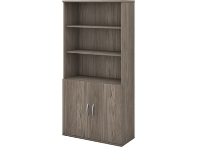 The Bush Business Furniture Studio C five-shelf bookcase with doors looks great, works hard, and adjusts to fit the needs of your office. Designed with two fixed and three adjustable shelves, the bookcase holds your books and reference materials with plenty of room for your favorite decorative accents. Confidently store a variety of items on the spacious and durable shelves, designed to hold up to 50 lbs. each. A thermally fused laminate finish fends off everyday damage such as scratches and stains throughout years of everyday use. Two doors with smooth Euro-style hinges conceal your office supplies and add an eye-catching touch to your workspace. This tall bookcase with doors comes with a 10-year warranty and meets ANSI/BIFMA quality test standards. See the full collection for coordinating items available to make your office your own with Bush Business Furniture Studio C. American-made with US and imported parts.