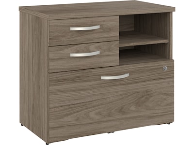The Bush Business Furniture Studio C office storage cabinet with drawers and shelves offers a stylish, long-lasting workplace organization solution for today's professionals. Keep important documents, office supplies, work in progress, and equipment in order so you can access the materials you need quickly and easily. A file drawer opens on smooth full-extension ball bearing slides for an effortless reach to letter-, legal-, and A4-size paperwork and can be locked to protect sensitive information. Two box drawers organize writing utensils, notepads, and other supplies, while the open shelves are perfect for frequently used items. This lateral file cabinet with shelves has been meticulously tested to meet or exceed ANSI/BIFMA standards for safety, durability, and performance and is backed by the Bush Business Furniture 10-year manufacturer's warranty. American-made with US and imported parts.