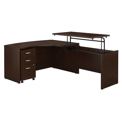 The Bush Business Furniture Westfield Right Hand 3 Position Sit to Stand L Shaped Desk with Mobile File Cabinet offers an ergonomic workspace for the health-conscious professional. A 60W x 43D Bow Front Desk and a 42W x 24D Sit to Stand Return attach to form a space-saving configuration, and both feature scratch-resistant 1 inch thick thermally fused laminate surfaces with wire management. The mechanical Lift-n-Lock system allows the Return to lock into place at standing heights of 36, 39 and 42 inches from the floor and easily returns to a seated position. The 3 drawer filing cabinet holds legal, letter and A4 size files and has a built-in lock to protect sensitive documents. Fixed desks and storage are tested to meet ANSI/BIFMA standards for safety and performance, and the mechanical lift is tested to meet BBF's own quality standards. Backed by a 10 year manufacturer's warranty.