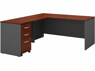 Spread out and save space with this Bush Business Furniture Series C L-shaped desk. 66"W and 48"W work surfaces offer ample room for your computer, phone, assignments and more, while the thermally fused laminate finish resists scratches and stains. Feed cables through wire management grommets in the desk surface and modesty panel to keep them out of your way. The mobile file cabinet rolls wherever you need it or fits conveniently underneath the L-shaped desk to conserve floor space. Clean lines, brushed nickel hardware, and extended modesty panels provide a professional appearance. Bush Business Furniture Series C offers endless layout options, expansion opportunities, and seven finishes. This affordable office furniture withstands the rigors of a 40-plus-hour work week and comes with a 10-year manufacturer warranty. American-made with US and imported parts.