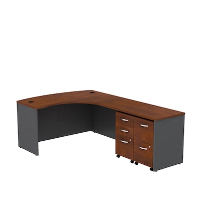 Bundle Includes: 60W x 43D Right Hand L-Bowfront Desk, 48W Return Bridge, 3-Drawer Mobile Pedestal, and 2-Drawer Mobile Pedestal