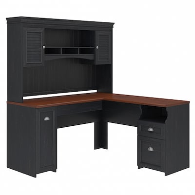 Bring a slice of modern farmhouse styling into your home office with the Bush Furniture Fairview L Shaped Desk with Hutch. Spread out, surf the net and pay bills on the durable surface, and stash supplies in the box drawer or open storage space. Organize mail in the letter-size file drawer or vertical closed storage area, and store your laptop or keyboard in a drawer with a drop-down front. Antique Pewter hardware, framed louvered doors and attractive moldings add character to your home office. Hutch features two closed storage areas, an open center shelf and three work-in-process cubby shelves. Attach the Hutch to either side of the Desk to fit your needs. Available in Antique Black with Hansen Cherry accents or Antique White with Tea Maple accents, Fairview meets ANSI/SOHO performance and safety standards and comes with a 6 Year Warranty. See the full collection for coordinating items.