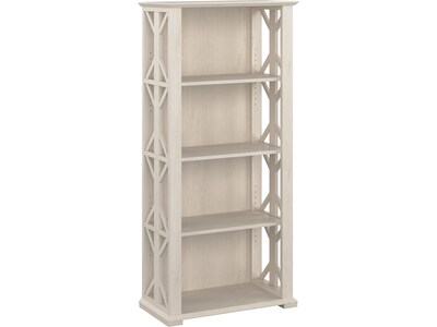 Organize books or give your workspace a personal touch with the Bush Furniture Homestead four-shelf farmhouse bookcase. Safely display pictures and decorations on shelves that support up to 50 lbs. each. Two shelves are fixed for stability, while two can be raised or lowered to accommodate items of various sizes. Tip Guard safety features include a stable design and wall attachment hardware for family-friendly safety in any space. The bookcase has been tested with a 50 lbs. hanging weight to create a safe environment in any work or living space. The decorative trestle pattern and chamfered profile edges give this bookcase a casual farmhouse style. This bookcase has been meticulously tested to meet or exceed the ANSI/SOHO quality standards for safety, durability, and performance and is backed by a 1-year manufacturer warranty. See the full collection for coordinating items.