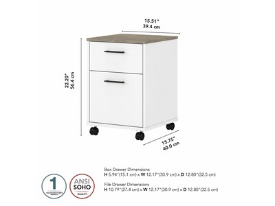 The Bush Furniture Key West two-drawer mobile file cabinet combines modern functionality and space efficiency to offer an excellent storage solution for your home office. A convenient box drawer organizes writing utensils, notepads, and more so the supplies you need are never out of reach. The file drawer opens on smooth, full-extension ball bearing slides for easy access to letter-size paperwork. This rolling file cabinet features locking front casters for secure placement and is finished on all sides to look great facing any direction. The two-drawer file cabinet fits conveniently under coordinating Key West desks (sold separately) to create an all-in-one personal workspace. This two-drawer file cabinet is tested to meet ANSI/SOHO quality standards for safety and performance and is backed by a 1-year manufacturer limited warranty. See the full collection for coordinating items available.