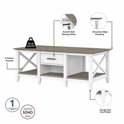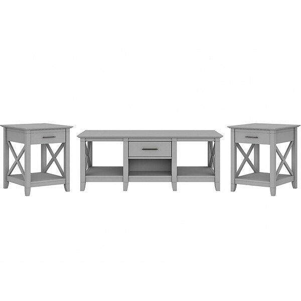 The Bush Furniture Key West coffee table with a set of two end tables is a perfect way to bring the feel of a coastal retreat right to your living room. Highlighted by X-shaped accents and a casual finish, this table set is a natural fit in homes that embrace farmhouse styling. Each side of the low coffee table features a box drawer above an open cubby space for organizing books, magazines, and other household items. Larger compartments on the right and left offer plenty of room for decorations or additional storage. The side tables also include a drawer for TV remotes, writing utensils, and more. A lower shelf provides even more storage and display capacity while the surface supports a lamp, a plant, or pictures. This living room table set has been tested to meet Bush Furniture's standards for safety, performance, and durability and is backed by a 1-year manufacturer warranty.