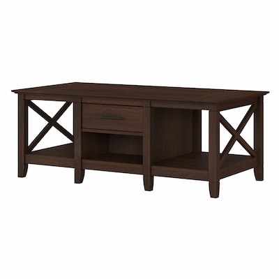 The Bush Furniture Key West coffee table with storage is a perfect way to bring the feel of a coastal retreat right to your living room. X-pattern accents on the side panels and your choice of casual finishes present a look that works well in homes that embrace cottage and farmhouse styling. A box drawer and lower cubby space in the center of the coffee table make it easy to organize books, magazines, and smaller items like TV remotes and writing utensils. Large open compartments on the right and left offer plenty of room for decorations or additional storage. Use the low coffee table on its own, or combine it with coordinating Key West products for a complete living room furniture set. This coffee table with drawers and shelves has been rigorously tested to meet Bush Furniture standards for safety, performance, and durability and is backed by a 1-year manufacturer limited warranty.