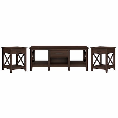 The Bush Furniture Key West coffee table with set of two end tables is a perfect way to bring the feel of a coastal retreat right to your living room. Highlighted by X-pattern accents and a casual finish, this table set is a natural fit in homes that embrace farmhouse styling. The low coffee table features a box drawer above an open cubby space for organizing books, magazines, and other household items. Larger compartments on the right and left offer plenty of room for decorations or additional storage. The side tables also include a drawer for TV remotes, writing utensils, and more. A lower shelf provides even more storage and display capacity while the surface supports a lamp, plant, or pictures. This living room table set has been tested to meet Bush Furniture standards for safety, performance, and durability and is backed by a 1-year manufacturer warranty.