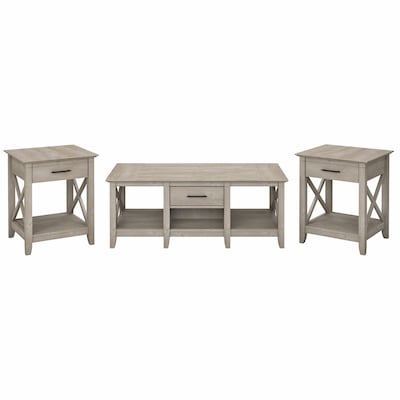 Featuring a relaxed modern farmhouse style, the Bush Furniture Key West coffee table with set of two end tables is a great fit for your casual living room. This set is a perfect way to bring the feel of a coastal retreat right to your living room. Highlighted by X pattern accents and a slightly weathered finish, this table set is a natural fit in homes that embrace farmhouse styling. Each side of the low coffee table features a box drawer above an open cubby space for organizing books, magazines, and other household items. Larger compartments on the right and left offer plenty of room for decorations or additional storage. The side tables also include a drawer for TV remotes, writing utensils, and more. A lower shelf provides even more storage and display capacity while the surface easily supports a lamp, plant, or pictures. This living room table set has been rigorously tested to meet Bush Furniture standards for safety, performance, and durability and is backed by a 1-year warranty.