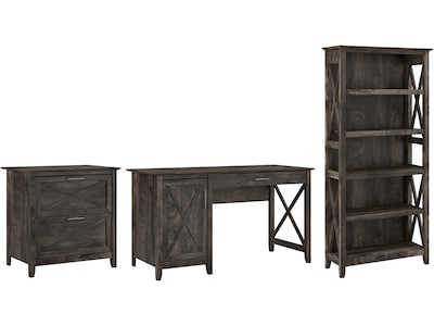 The Bush Furniture Key West 54"W computer desk with lateral file cabinet and five-shelf bookcase provides a home office furniture set with casual farmhouse style. The Bush Furniture Key West 54"W computer desk with two-drawer lateral file cabinet and five-shelf bookcase offers a refreshing approach to working in your home. Spread out on a durable 54"W x 24"D desktop that boasts a weight capacity of 200 lbs. The top drawer is an ideal place to store your keyboard or laptop while a built-in storage cabinet with one adjustable shelf accommodates materials of various sizes. The lateral file cabinet's drawers open on smooth full-extension ball bearing slides for an easy reach to legal- and letter-size documents. The bookcase features three adjustable shelves and two fixed shelves for flexible storage and display. Each shelf supports up to 50 lbs. so you can show off your favorite books and decorations with confidence. This desk with storage is tested to meet ANSI/SOHO quality standards for safety and performance and is backed by a 1-year warranty.