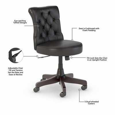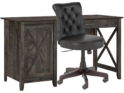 The Bush Furniture Key West 54"W computer desk with storage and mid-back tufted office chair brings a relaxed style to any home workspace. Spread out with a computer and paperwork on the desktop as you take on your next project, pay bills, or surf the web. A keyboard tray with a flip-down front pulls out from under the desk and can also be used to hold a laptop. Keep reference materials and office supplies organized and accessible inside a built-in storage cabinet with one adjustable shelf. The office chair, featuring button-tufted upholstery and a scrolled backrest, provides a perfect complement to Key West's easy-going style. Foam cushioning gives the seat a medium-firm feel, while the adjustable desk chair's height and tilt tension can be adjusted to meet your own preferences. This desk and chair set is tested to meet ANSI/SOHO standards and is backed by a 1-year warranty.