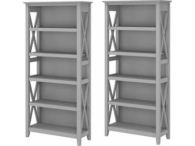 The Bush Furniture Key West tall five-shelf bookcase set is a perfect way to show off your favorite artwork, photos, plants, and more. These matching bookcases each include three adjustable shelves to accommodate items of various sizes and two fixed shelves for stability. Each shelf supports up to 50 lbs. so you can store your collection of paperback and hardcover books or display decorations with confidence. Place the tall bookshelf set side by side to create a storage wall or position them separately based on the needs of your space. Stylish touches include X-pattern accents on the side panels as well as a sturdy and attractive post-leg design. Wall attachment hardware is included for family-friendly safety and security in any home office or living room. These five-shelf bookcases are tested to meet ANSI/SOHO quality standards for safety and performance and are backed by a 1-year warranty.