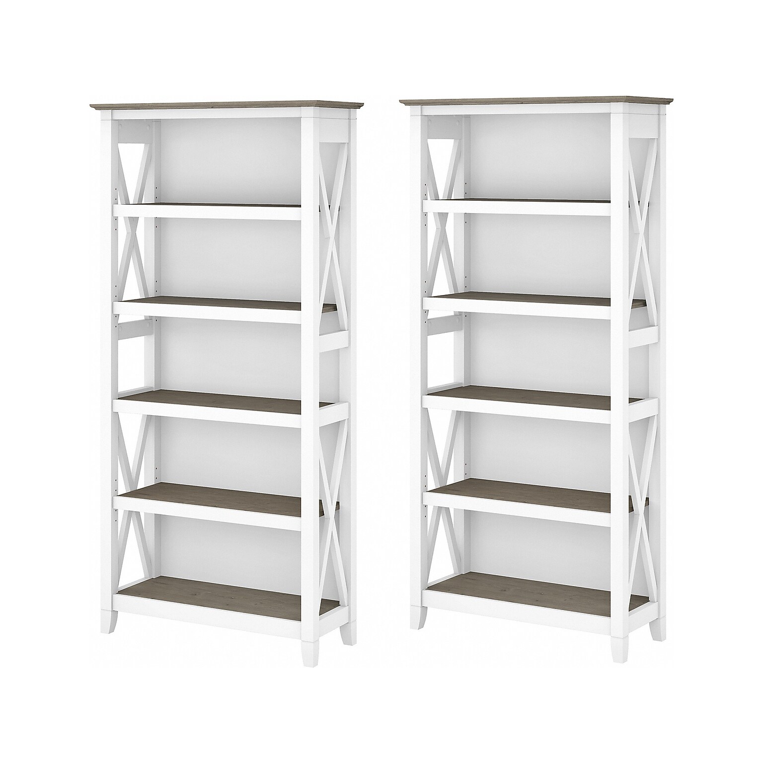 Bush Furniture Key West 66"H 5-Shelf Bookcase with Adjustable Shelves, Shiplap Gray/Pure White Laminated Wood, 2/Set (KWS046G2W)