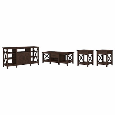 The Bush Furniture Key West tall TV stand with coffee table and set of two end tables is a perfect way to bring the feel of a coastal retreat right to your living room. Get together for movie night or catch up on your favorite show around an entertainment center that supports a 65" TV or 75 lbs. An upper shelf with cable management provides a place for components, while the two-door cabinet and open storage areas organize movies, games, and more. The low coffee table has a box drawer and a cubby space in the center, and two open cubbies for books, magazines, and other household items on the sides. The side tables also include a drawer for small accessories like TV remotes and writing utensils, while the surface easily supports a lamp, plant, or pictures. This living room table set has been rigorously tested to meet Bush Furniture standards for safety, performance, and durability and is backed by a 1-year warranty.