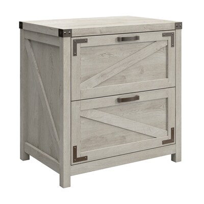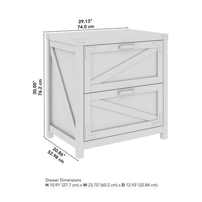 The Bush Furniture Knoxville 2 Drawer Lateral File Cabinet offers a practical storage solution with appealing modern farmhouse style. Take advantage of two large file drawers to keep letter, legal and A4-size paperwork organized in your home office. Drawers support up to 50 pounds of materials each and are designed to open one at a time for maximum stability on any surface. Full-extension ball bearing slides provide an effortless reach to contents, even those all the way at the back. The 2 Drawer File Cabinet matches the height of Knoxville's 48W Writing Desk and 60W L Shaped Desk to create an extended work surface when placed side by side. This two drawer lateral filing cabinet has been tested to meet ANSI/SOHO standards for safety and performance and is backed by a 3 Year Manufacturer's Warranty. See the full collection for coordinating items available.