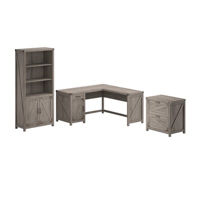 The Bush Furniture Knoxville 60W L Shaped Desk with Lateral File Cabinet and 5 Shelf Bookcase offers a personal workspace solution with appealing modern farmhouse style. Spread out on a work surface that extends 60 inches in each direction, supports up to 200 pounds and includes built-in wire management to keep cords and cables out of the way. Work materials and home office supplies can be stashed neatly inside the corner desk's storage cabinet and drawer. Use the lateral filing cabinet's spacious drawers to store letter, legal and A4-size paperwork. The Bookcase with Doors' combination of open and closed storage is perfect for organizing your personal library while also brightening up the room with pictures and decorations. This home office furniture set has been tested to meet ANSI/SOHO standards for safety and performance and is backed by a 3 Year Warranty.