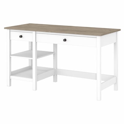 The Bush Furniture Mayfield 54"W computer desk with shelves combines casual looks with a practical design you'll love when taking on your next project. Stay on top of your daily tasks with a workspace that suits your casual home. Highlighted by its relaxed modern farmhouse style, the Bush Furniture Mayfield 54"W computer desk with shelves also includes plenty of practical features to keep you feeling productive. Spread out on a durable 54"W x 23"D work surface that supports a computer, books and more with a weight capacity of 200 pounds. Two shelves and a small box drawer ensure that the papers and supplies you need are always within reach. The lower shelf is fixed for stability while the upper shelf can be raised or lowered to accommodate items of various sizes. A larger drawer pulls out for easy access to your keyboard or laptop and features a flip-down front that folds up neatly when not in use. This farmhouse desk with storage is tested to meet ANSI/SOHO quality standards for safety and performance and is backed by a 1-year warranty.