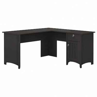 Make your home office space comfortable, functional and beautiful with the Bush Furniture Salinas L Shaped Desk. Attractive wood details, vertical accents and tapered legs create a casual look fit for a cottage, family home or apartment. Metal drop pull hardware complements the Vintage Black finish, which features a distressed touch to add a country feel to your space. You'll love all the room you have to multitask on the L Shaped Desk surface, designed to save space in your home with a variety of placement options, including in the corner. Have a cup of coffee as you surf the net, pay bills or read a good book, and enjoy all the legroom you need with the open design. A box drawer stores small office items while a storage cabinet includes an adjustable shelf for larger supplies. Backed by a 1 Year Warranty, the L Shaped Desk with Storage meets ANSI/SOHO standards for safety and quality.
