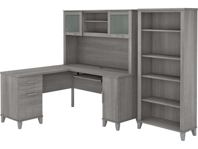 The transitional Bush Business Furniture Somerset 60"W L-shaped desk with hutch and five-shelf bookcase offers an ideal solution for the home or small office. With practical features and stylish design, the desk with hutch and five-shelf bookcase delivers a perfect personal workspace. The 59"W surface with wire management offers ample room to spread out while a pull-out shelf for a keyboard or laptop, vertical cabinet, box drawer, and file drawer offer plenty of storage. The hutch features a large open compartment and two frosted glass doors for concealed storage. Two of the bookcase's shelves are fixed for stability and three are adjustable to ensure that items of all sizes have their place. Transitional styling includes your choice of attractive finishes with tapered leg accents and contemporary metal hardware. This home office furniture set is tested to meet ANSI/SOHO quality standards for safety and performance and is backed by the Bush Business Furniture 6-year manufacturer warranty.