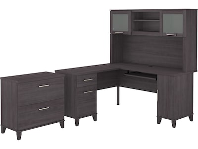 Build your perfect home office around the stylish and functional Bush Furniture Somerset L-shaped desk with hutch and lateral file cabinet. The 60"W surface with a wire management grommet offers ample room to spread out while a pull-out tray for a keyboard or laptop, vertical cabinet, box drawer, and file drawer provide plenty of storage space for supplies. The hutch has an open compartment and two frosted glass doors for concealed storage. The lateral file cabinet features smooth ball-bearing slides for easy access to legal- and letter-size paperwork and drawers that open one at a time for maximum stability. The transitional styling includes an attractive finish with tapered leg accents and contemporary metal hardware. This home office furniture set is tested to meet ANSI/SOHO quality standards for safety and performance.